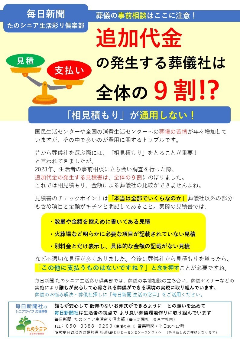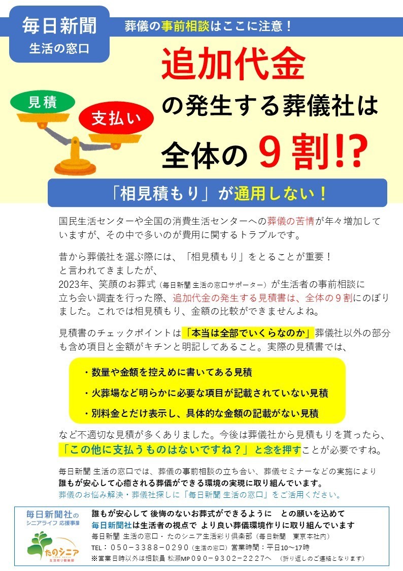 昔から葬儀社を選ぶ際には、「相見積もり」をとることが重要! と言われてきましたが、 2023年、当社が新聞社と共同で葬儀の事前相談立ち会い調査を行った際、追加代金の発生する見積書は、全体の9割にのぼりました。