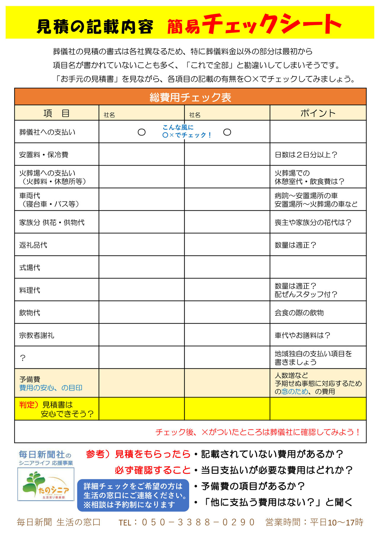 見積書のチェックポイントは「本当は全部でいくらなのか」葬儀社以外の部分 も含め項目と金額がキチンと明記してあること。実際の見積書では、